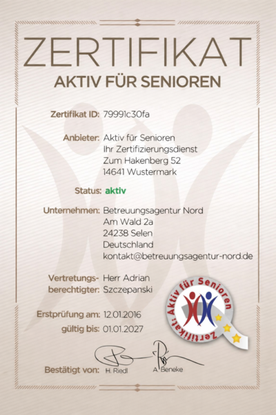 Viele ältere und pflegebedürftige Menschen wünschen sich, so lange wie möglich in ihrer vertrauten Umgebung leben zu können. Eine Betreuung im eigenen Zuhause bedeutet für die meisten Seniorinnen und Senioren mehr Lebensqualität, Sicherheit und ein großes Stück Unabhängigkeit. Die Betreuungsagentur Nord vermittelt deutschlandweit qualifizierte 24-Stunden-Pflege- und Betreuungskräfte aus Osteuropa, die eine einfühlsame und zuverlässige 24-Stunden-Pflege & Betreuung zu Hause ermöglichen. Diese Form der häuslichen Betreuung ist für viele Familien eine sinnvolle Alternative zum Alten- oder Pflegeheim. Eine verlässliche 24-Stunden-Pflege zu Hause entlastet Angehörige spürbar und trägt dazu bei, dass Pflegebedürftige würdevoll leben, sozial eingebunden bleiben und Wertschätzung erfahren. Unsere 24-Stunden-Seniorenbetreuung bietet eine rechtlich sichere, transparente und fürsorgliche Betreuungslösung. Gemeinsam finden wir das passende Pflege- oder Betreuungsmodell – individuell abgestimmt auf die jeweilige Lebenssituation.